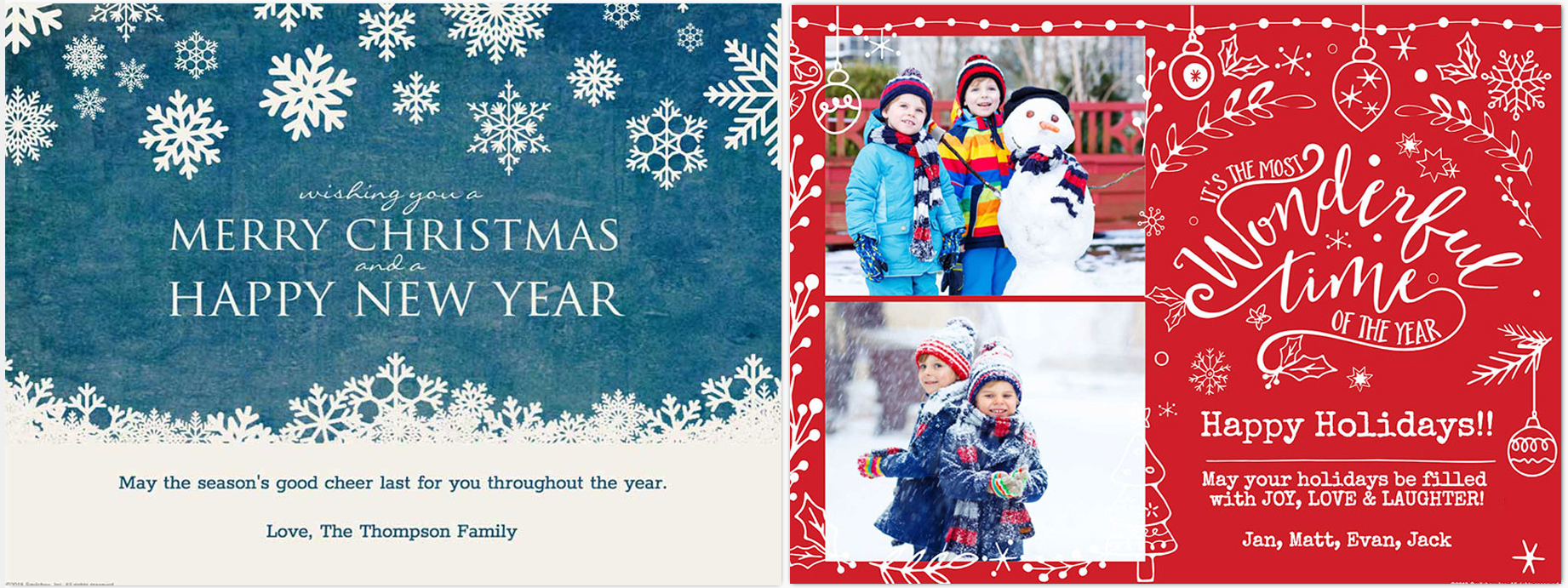 Next, pick out your favorite photo from the family shoot, and finalize that Christmas card. If you want to avoid post office stress, postage costs, and the headache of tracking down mailing addresses, go for an eCard. It’s easier, quicker, and less expensive than traditional printed cards. It’s also a much more practical way to get your card to friends and family near and far: whether they’re travelling for the holiday season, in the military, across the globe or even next door! For ideas on perfecting your Christmas card look, check out our huge collection of professionally-designed, easy-to-customize eCard templates for Christmas.